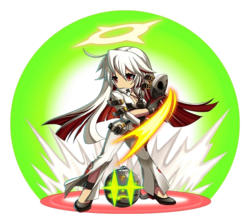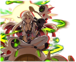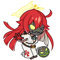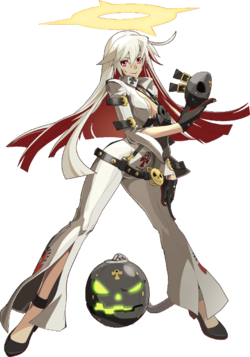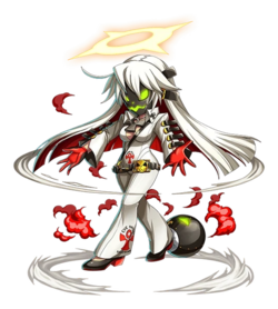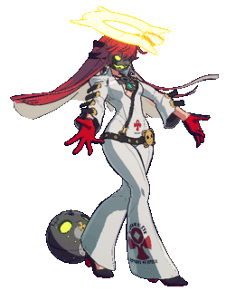 Alternate Forms/Disguises: By the end of Guilty Gear Xrd -Revelator-, her hair becomes fully red. In Guilty Gear -Strive-, her hair color changes to predominantly red with white highlights underneath, her eyes become green, and her halo appears cracked.