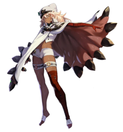 Clothing/Outfit: In Guilty Gear Xrd -SIGN-, Ramlethal wears a black and white cap with ear-like extensions and a large white cape with shoulder pads and arm openings. The cape has an organic appearance, with a flesh-toned underside and saw-like teeth along the edges. Beneath it, she wears white shorts and a wide white strap with a round buckle as a tube top, along with smaller straps on her arms and thighs. She has bands on her feet and typically goes barefoot. In -Revelator-, a small four-leaf clover is added to the right ear of her cap. In -Strive-, her outfit changes slightly—she wears a sleeveless black and neon green shirt beneath a white, double-breasted waistcoat exposing her midriff. Her cap is redesigned with shorter ears, and she wears dark red wraps on her arm and leg along with white thigh and foot bands.