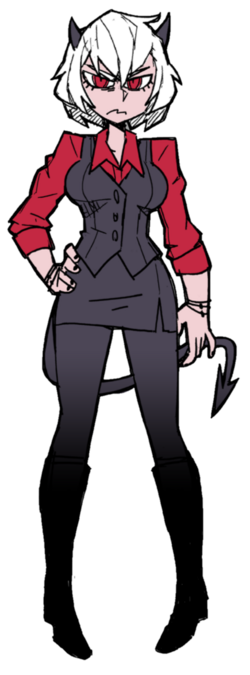 Alternate Forms/Disguises: Malina does not possess alternate forms, but her appearance varies slightly depending on whether she is actively working in Hell or off-duty, primarily reflected through the presence or absence of her tie and her more relaxed posture.