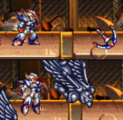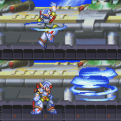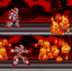 Eager to help protect the world, X travelled to the Highway where Sigma's forces were storming the city. He saw some success in taking down Mechaniloid soldiers, but was swiftly defeated by former Maverick Hunter Vile, who descended from the Death Rogumer piloting a Ride Armor and caught X with a paralysis shot. Just as X was caught helpless in Vile's grasp, Zero appeared and destroyed the arm of the Ride Armor, forcing Vile to flee on the Death Rogumer. X was disappointed by his inability to fight Vile, but Zero assured him that he held the potential to one day surpass Vile and even himself. Zero then informed X that he would perform reconnaissance to find Sigma's fortress, leaving the rest of the defense against the rebellion up to him.