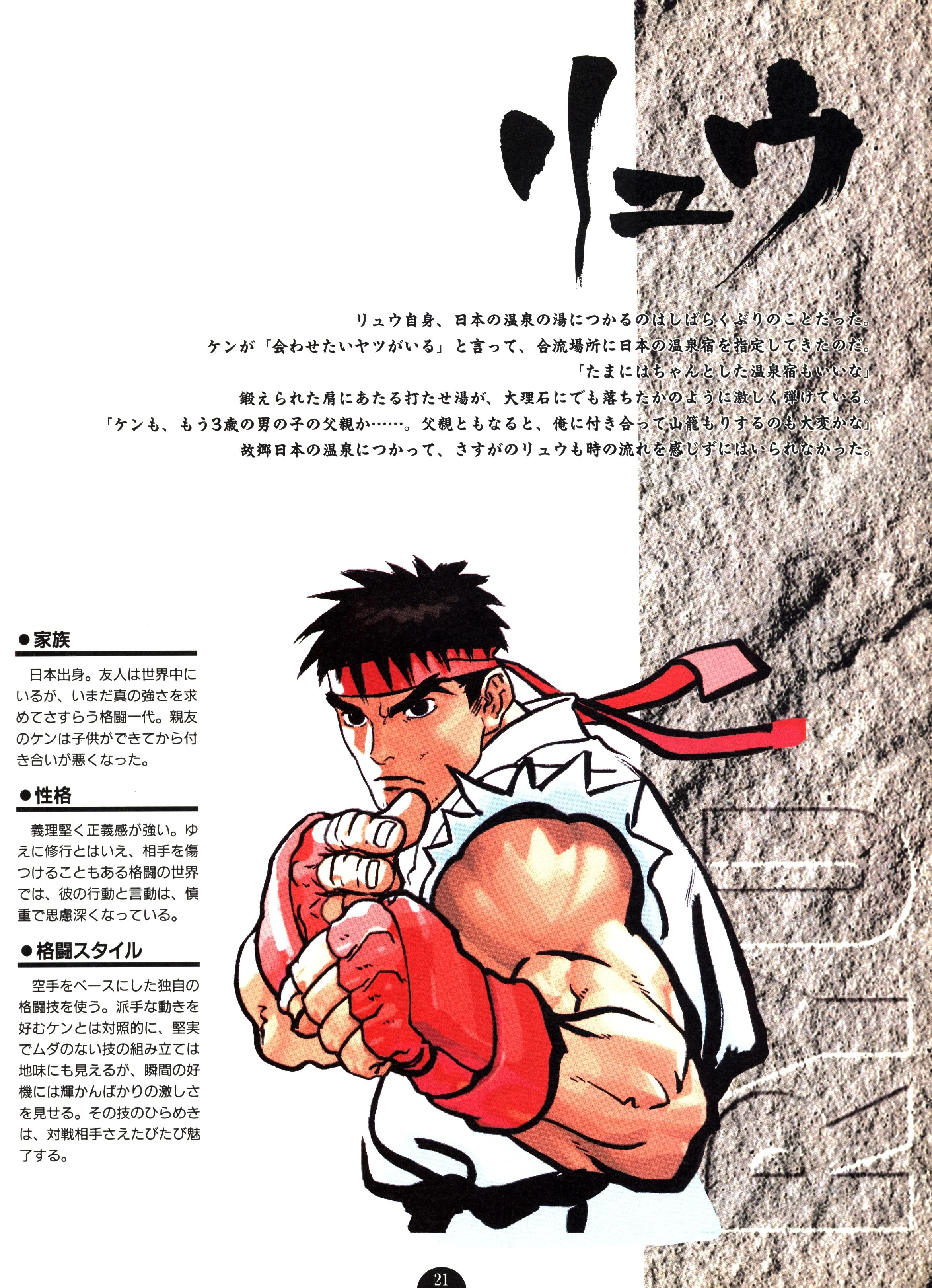 Ryu was born in Japan, and his wanderings have gained him friends throughout the world. He still travels the globe, searching for a real fighting spirit, frequently stopping to reunite with an old sparring partner. Ken's child has made Ryu take his own life into account.