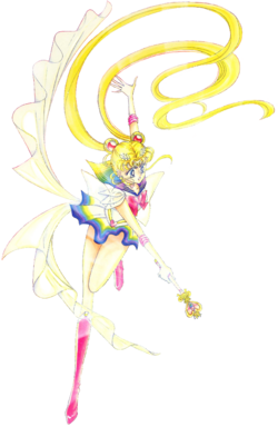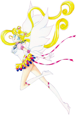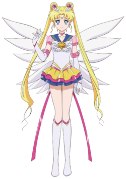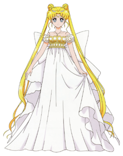 At the end of the Infinity and Dream arcs, Usagi takes a form resembling her future self: Neo-Queen Serenity. Compared to her Princess form, the bow at her back is much larger. Her dress is longer and the ribbons from it are longer as well. She carries her Spiral Heart Moon Rod in the Infinity arc, and her Eternal Tiare in the Dream arc. Unlike her future self, her hair is still yellow and she does not wear a crown; though, some artwork depicts this form with a crown.