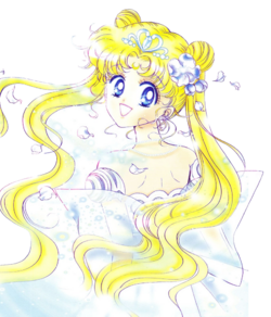 Usagi occasionally takes the form of her past-life: Princess Serenity. In this form, Usagi wore a white flowing gown with white shoulder pieces disconnected from her dress, an intricately decorated bodice with gold hoops, with the bust defined by a row of golden beads. Trailing at the back, was a white gauzy bow with long fluttery ribbons. Under the dress she wore white stiletto high heel shoes. She also wore golden spiral earrings and a six round hairpins, three on each side, similar to her Sailor forms. Unlike her past self, her hair is yellow instead of white.