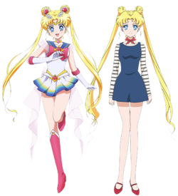 When Usagi became Eternal Sailor Moon, her uniform underwent the most radical changes; she no longer wears a tiara and instead has a golden crescent moon on her forehead, her leotard no longer has chest armor, her earrings have a golden star attached beneath each crescent moon, and her choker is red and v-shaped with a pink heart at the center and a golden crescent moon beneath it. The collar itself is like her original one, but it is a darker shade of blue with three golden stripes. In the place of her shoulder pads are pink bubble-like sleeves with two red fittings at the ends; they have somewhat of a translucent aspect to them. In the area where her chest bow was located is a pair of white angel wings with a pink heart that has a golden crescent moon attached to it sitting at its center. Her gloves now have red, v-shaped wristbands with golden crescent moons on them, the fittings at the ends of the gloves have feather barrettes attached to them similar to the ones in her hair, and the gloves themselves are now extended to reach up to her upper arms. Her belt is now comprised of two ribbons (the one on top is yellow and the one beneath it is red) clipped together by a golden crescent moon; the bottom ribbon extends past her skirt, mimicking the flowing effect that her previous back bow had. Her back bow is replaced with a set of large white angel wings, her skirt is now composed of three layers (the top layer is yellow, the middle layer is red, the bottom layer is blue), and her boots are now white and knee-length with a slightly larger heel and red v-shaped borders that have golden crescent moons on them.