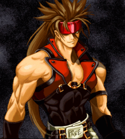 Clothing/Outfit: Sol typically wears a black undershirt beneath a red and black sleeveless jacket, paired with white jeans and several belts. His belt buckle is engraved with the word "FREE," and a red cloth drapes down from it. He completes his look with red shoes and black fingerless gloves. One of his signature accessories is a single belt wrapped around his left bicep. In later appearances, Sol’s outfit evolves into a long-sleeved red leather jacket with handcuff-like straps on the sleeves and a black accent running down the back, maintaining his rugged and battle-ready aesthetic.