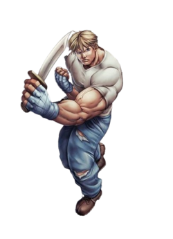 General Description: Cody has a lean, muscular build with an athletic frame. He typically maintains a serious or neutral expression, though occasional subtle smirks appear. His hair color varies from dark blond in earlier games to light blond in most Street Fighter appearances.