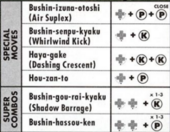| Super Combo | Bushin Musousenka | ↓↙← ↓↙← + K (Level 3) [X][A] |