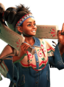 - Default Outfit: Blue and white poncho with red and green designs, red and white bead necklace, white feathery earrings, red, white, and blue headband, red hair ties, torn pink shorts with white belt, and brown boots trimmed in the colors of the Mexican flag with white tassels above the ankles.