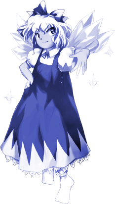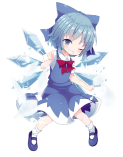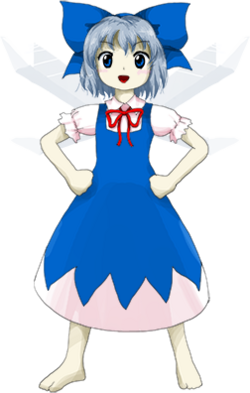 Cirno (チルノ Chiruno) is an ice fairy who typically resides in an igloo near Misty Lake. She is known for playing pranks that involve freezing objects or toads, all while maintaining a belief that she is stronger than everyone else. Cirno first appeared as the Stage 2 boss in Embodiment of Scarlet Devil and has since reappeared as a playable character in multiple games beginning with Phantasmagoria of Flower View. She serves as the main protagonist of Great Fairy Wars and is one of several protagonists in both Touhou Hisōtensoku and Hidden Star in Four Seasons.