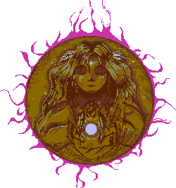 Facial Features: The girl within the disk has long hair and a content expression with her eyes closed. Ribbons or feathers flank both sides of her head, positioned on either side of a white dot on her forehead.