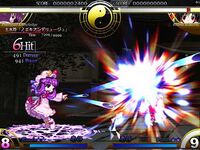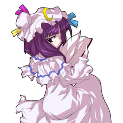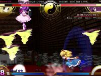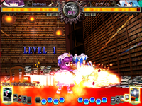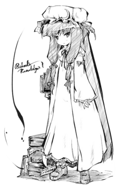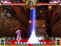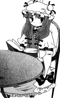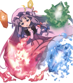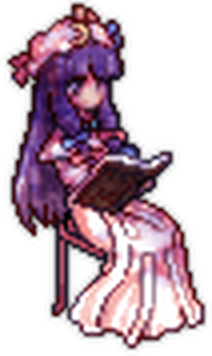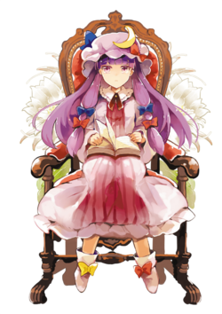 Patchouli Knowledge (パチュリー・ノーレッジ Pachurii Nōrejji) is a youkai magician and witch who resides in the library of the Scarlet Devil Mansion. She is close friends with the mansion's mistress, Remilia Scarlet, and serves as her librarian. Patchouli first appeared as the Stage 4 boss in Embodiment of Scarlet Devil and has been a playable character in several fighting games starting with Immaterial and Missing Power. She can also appear as a supporting character for Marisa Kirisame in Subterranean Animism.