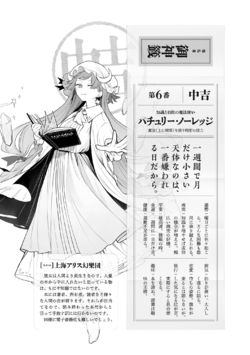 | The Unmoving Great Library, Patchouli Knowledge Species: Witch A witch who has settled down in the Scarlet Devil Mansion. Unlike the mistress of the house, she is not weak against sunlight; however, she does not go out much. She spends her days in a library where the sunlight cannot reach. This is so that the books won't be damaged, but the unhealthy atmosphere is bad for her health. She doesn't have a very proactive personality, but rather always walks her own path. However, she is always interested where knowledge is concerned and will proactively go and try to acquire it. She does everything by the book, but still makes a lot of mistakes. Although she is quite skillful, her complete lack of physical fighting ability can't be helped. She pretty much never attempts to directly punch or kick her opponent. She makes up for this with her knowledge of a great variety of powerful magic. She's more at ease using magic than trying to attack physically. Dividing the magic she uses according to the days of the week is a secret hobby of hers, but no one has realized this. |
