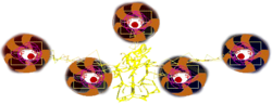 General Description: YuugenMagan is a hovering set of five independently-moving eyes. The eyes are connected by what appears to be an electric-like force and are surrounded by strange markings on the screen.
