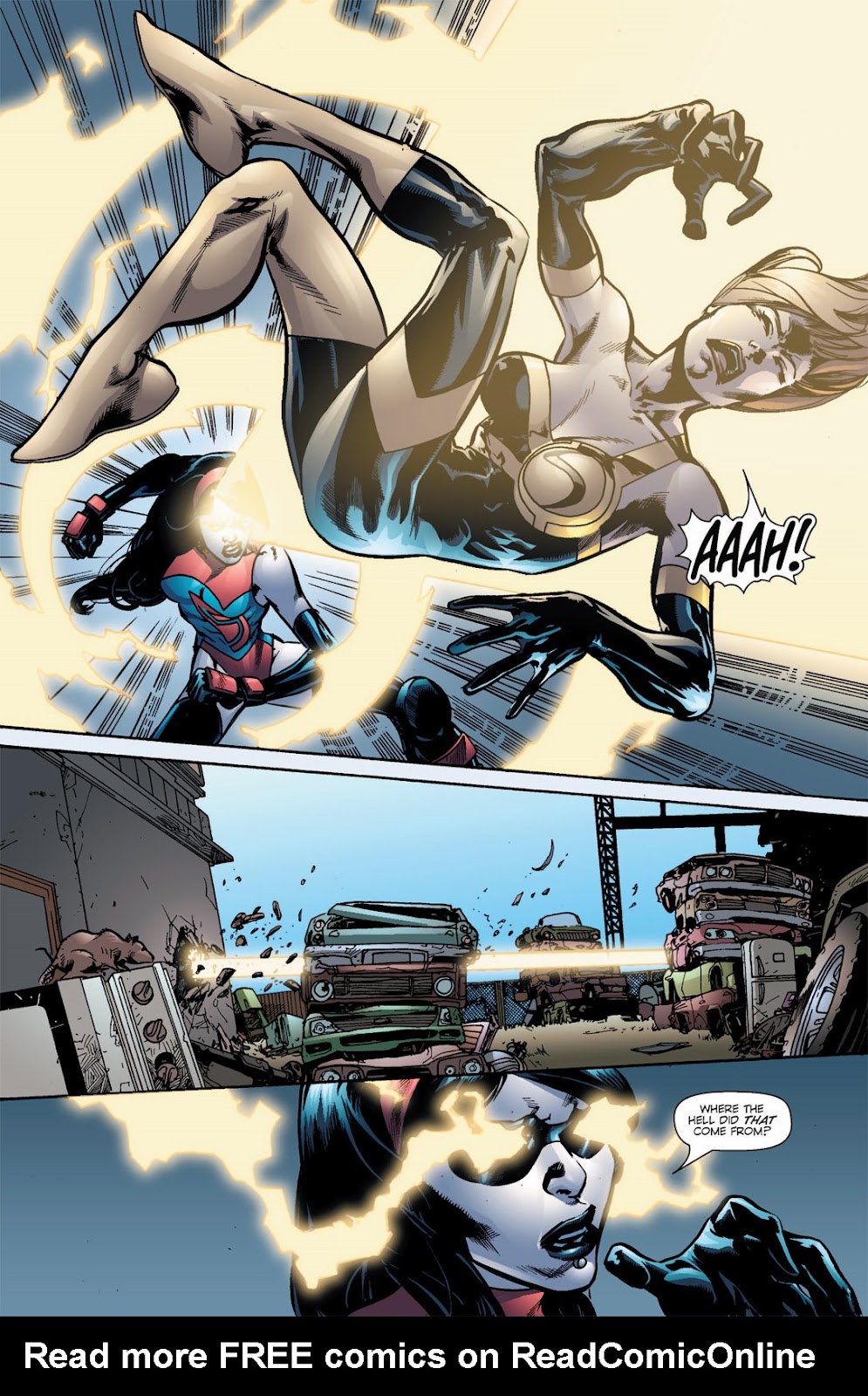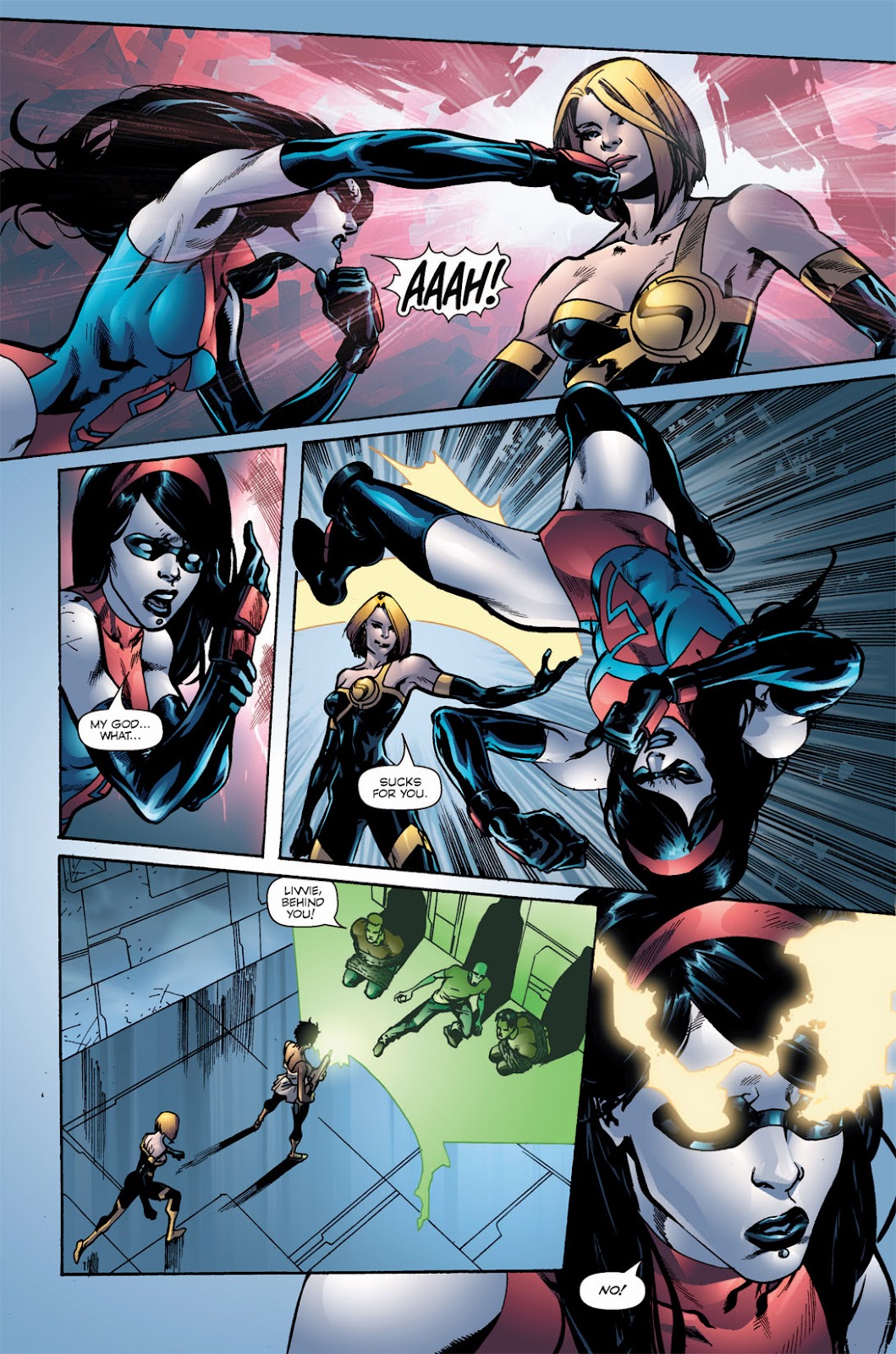 Enhanced Senses (Can scan the environment around her and detect beings behind objects, Her new vision also allows her to see events before they happen[1]), Energy Beams (Shown here), Light Manipulation (She can use her eyes as a flashlight[2]), Transformation,